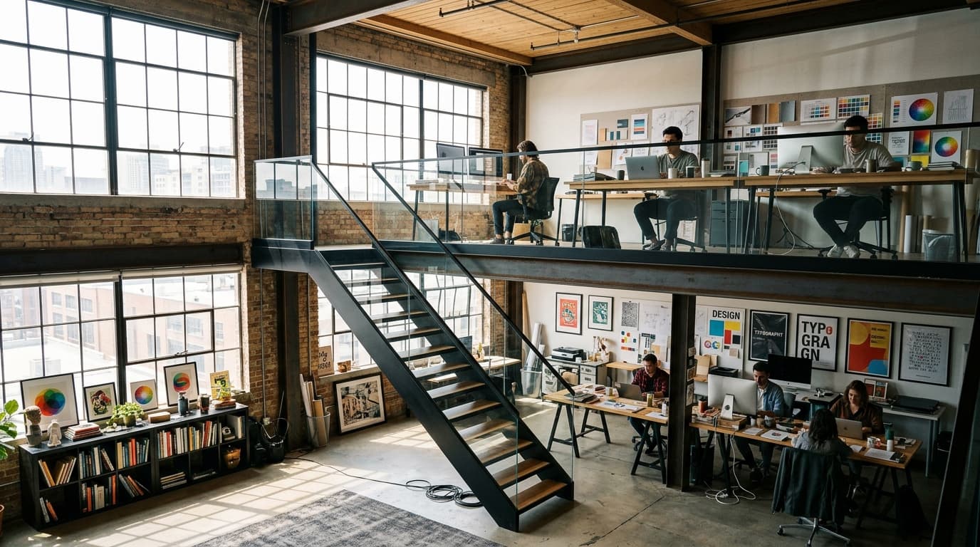 Лестница. В двухуровневой студии это не просто путь наверх, а главный графический элемент. Если лестница громоздкая, она «съест» полезную площадь внизу. Если хлипкая — каждый подъем сотрудников будет сопровождаться грохотом, который мешает переговорам.