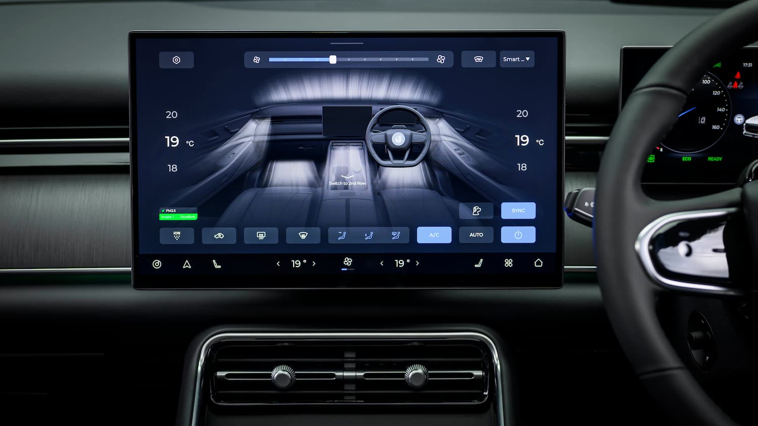 Первое, что видишь за рулём, — это экраны. Не один случайный планшет, вкрученный саморезами в торпедо, а продуманная «цифровая панель», визуально встроенная в интерьер.