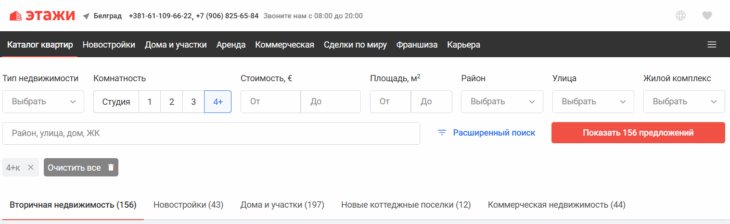 Посмотрите, например, на страницу каталога 4-комнатных квартир в Белграде от Etagi — https://belgrade.etagi.com/realty/chetirehkomnatnye-kvartiry/. Здесь переключатель комнатности расположен в первой линии фильтров, сразу под вкладками «Купить / Снять / Продать». Его простая, но логичная структура помогает пользователю буквально за несколько секунд сформулировать запрос — без лишних вводов и обновлений страницы.